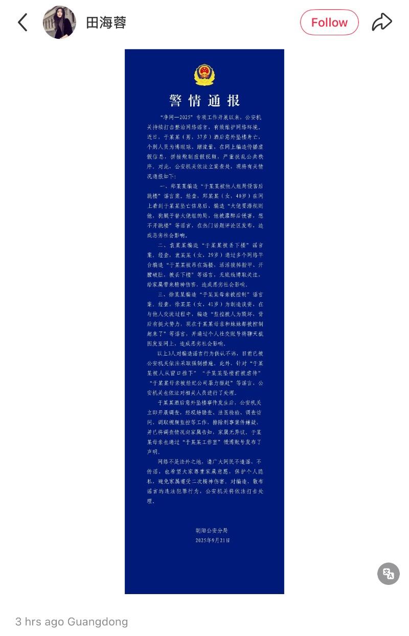 中国警方在 21 号晚上发了声明群益证券,回应了有关于朦胧坠亡一事,当中表示有 3 人涉及造谣,详情如下。