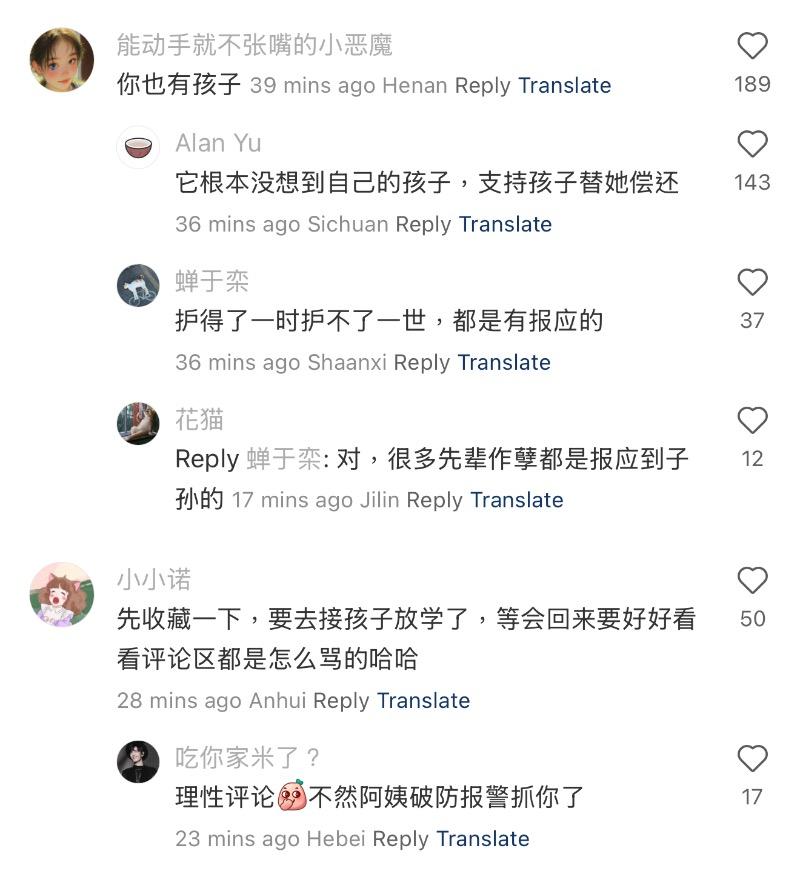 但她没有关闭评论区,大量负面评论出现在其评论区,有些甚至威胁其孩子。